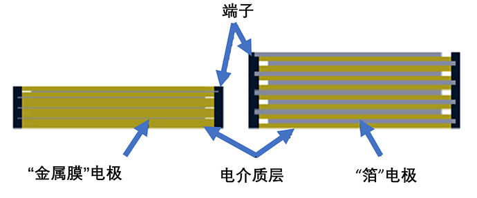 薄膜電容啊,說白了就是一種用紙或者一些聚合物做成的靜電器件。這些材料會形成很薄的片,跟電極材料混在一起就成了電容。人們說的“薄膜電容”,就是指這種用這種工藝做出來的任何器件。而“薄膜”這個詞指的是那些介電材料的性質。如果說“金屬”用來修飾“薄膜”,比如“金屬膜”或者“金屬化膜”,那就是更具體地指那種電極材料非常薄(10納米)的器件,通常是用真空沉積工藝做在支撐基板上的。經常使用的襯底也用作電容的介電材料,但不一定每次都是這樣。相比之下,“箔”電極電容用的電極材料就像我們家里用的鋁箔,這種材料的厚度足夠(微米數量級),可以在機械上自我支撐。